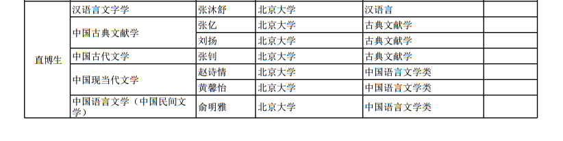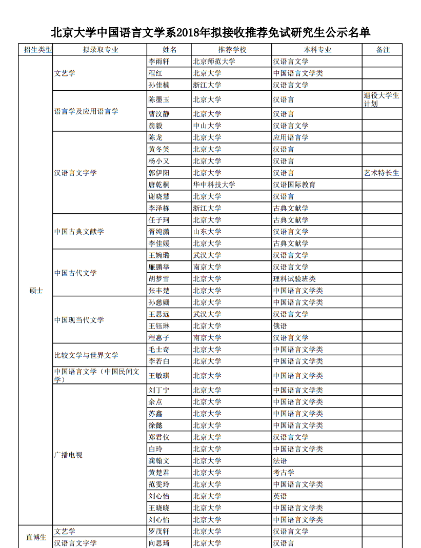 北京大学中文系2018年拟接收推免研究生公示名单