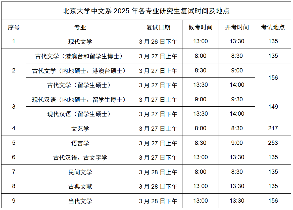 2.各专业复试安排如下(考试地点均在北京大学人文学苑6号楼会议室):